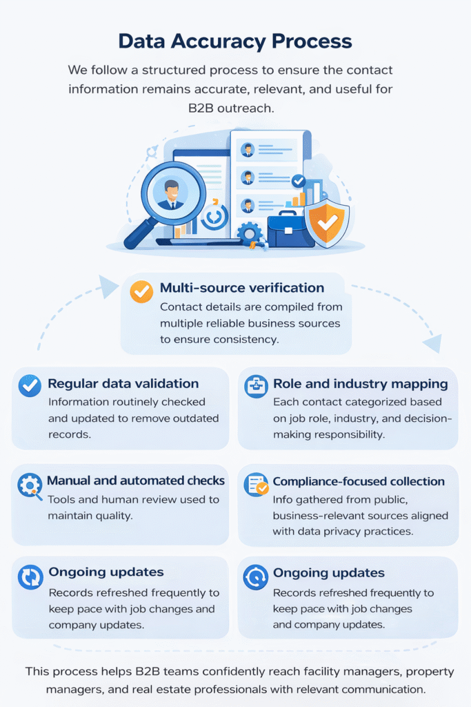 Our Facility Manager email list is meticulously verified and updated monthly to ensure 95%+ accuracy. Using advanced validation tools, we guarantee reliable, high-quality contacts for your B2B marketing campaigns. Trust our verified data to connect you with the right decision-makers every time.